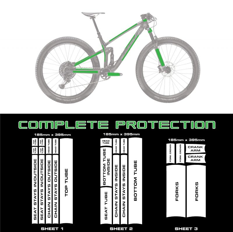 Protect your investment with this Complete Frame Protection Kit. These will help protect your paintwork from scratches and chips caused by shuttle damage, stacks and loose stones, keeping your frame looking fresh and new. With multiple colour and design options available, your bike will never look better!