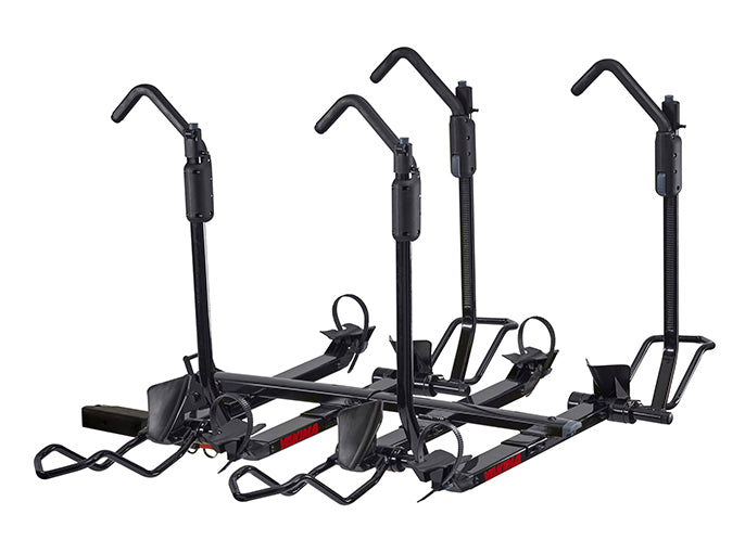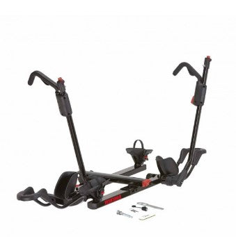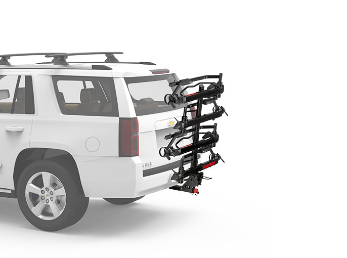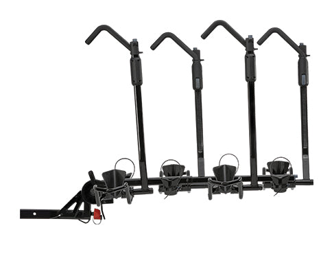 Great for families, double dates, or bringing your entire bike quiver, the HoldUp EVO +2 turns the HoldUp EVO 2" into a four-bike carrier. It's versatile enough to handle most bikes, from BMX to fat tyre bikes. The StrongArm hook secures the bikes at their wheels, protecting carbon frames and painted surfaces. The whole unit can still tilt down and out of the way with bikes loaded, for easy rear-of-vehicle access, and the empty trays fold up and out of the way when not in use. Included SKS locks for each bike give you peace of mind.